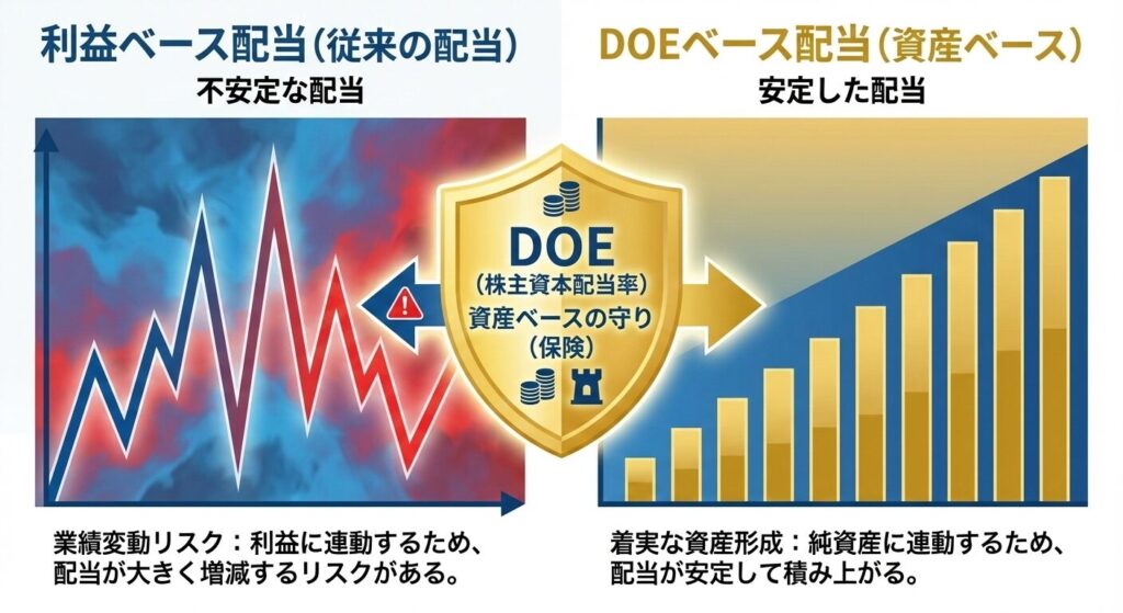 通常、配当は「その年の利益」から出されますが、DOEは「積み上がった純資産(自己資本)」をベースに計算されます。